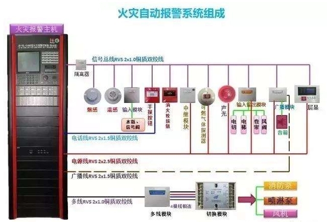 火灾自动报警系统是由触发装置、火灾报警装置、联动输出装置以及具有其它辅助功能装置组成的,它具有能在火灾初期,将燃烧产生的烟雾、热量、火焰等物理量,通过火灾探测器变成电信号,传输到火灾报警控制器,并同时以声或光的形式通知整个楼层疏散,控制器记录火灾发生的部位、时间等,使人们能够及时发现火灾,并及时采取